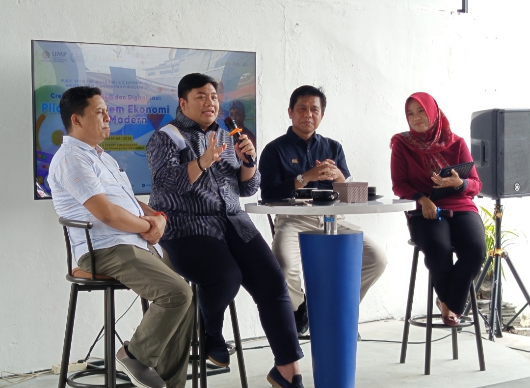 PURWOKERTO — Pusat Studi Kebijakan Publik dan Kepemimpinan Universitas Muhammadiyah Purwokerto (UMP) mendorong penguatan ekosistem ekonomi kreatif berbasis kampus melalui diskusi publik bertajuk Creative Hub, UMKM, dan Digitalisasi: Pilar Ekosistem Ekonomi Kreatif Modern, yang digelar di Samara Cafe & Eatery, Senin (16/2/2026).