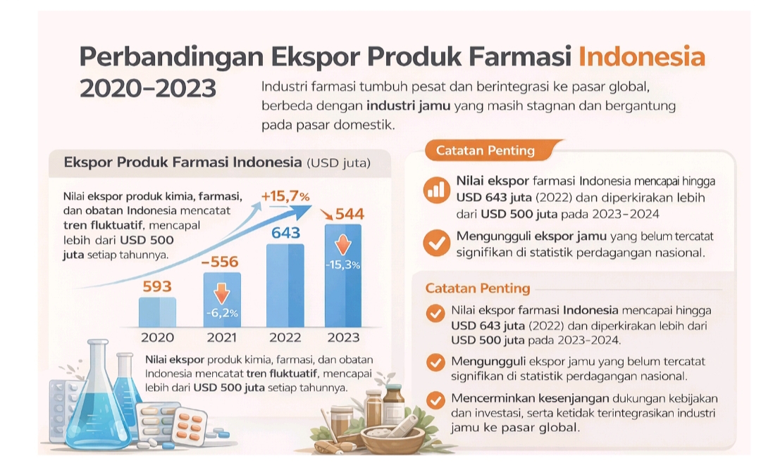 Selain itu, nilai ekspor produk farmasi Indonesia pada 2023 telah mencapai lebih dari USD 500 juta dengan tren meningkat. Sebaliknya, ekspor jamu belum tercatat signifikan. Lebih jauh, catatan yang ada terlihat secara terpisah dalam statistik perdagangan nasional. Ini menandakan ketergantungan yang tinggi pada pasar domestik. Perbedaan ini mencerminkan kesenjangan dukungan kebijakan, investasi riset, dan integrasi sistem kesehatan. Ini juga temuan kritis bahwa selama ini, negara menganaktirikan industri jamu dan komunitasnya.