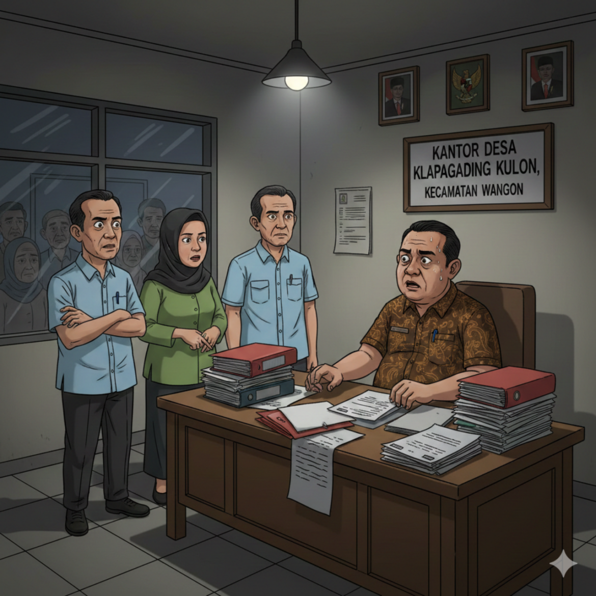 Banyumas, purwokerto.info – Konflik berkepanjangan antara Kepala Desa Klapagading Kulon, Kecamatan Wangon, Karsono, dengan sembilan perangkat desanya berdampak serius terhadap pelayanan publik. Akibatnya, warga menjadi pihak paling dirugikan, mulai dari terhambatnya pelayanan administrasi hingga ratusan bahkan diperkirakan ribuan warga kehilangan hak atas bantuan pemerintah.