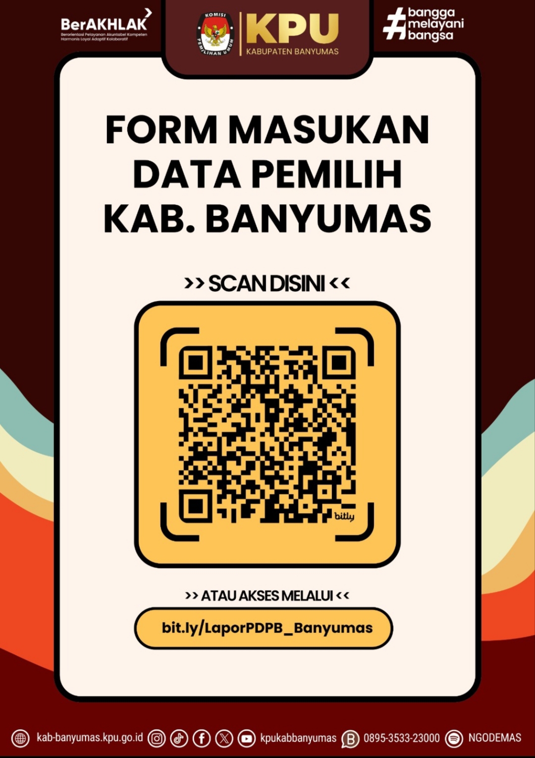 Mohon kiranya dapat melaporkan informasi tersebut melalui Tautan bit.ly/LaporPDPB_Banyumas atau menghubungi kami secara langsung. Kontribusi Bapak Ibu sangat berarti demi data pemilih yang akurat dan berkualitas.