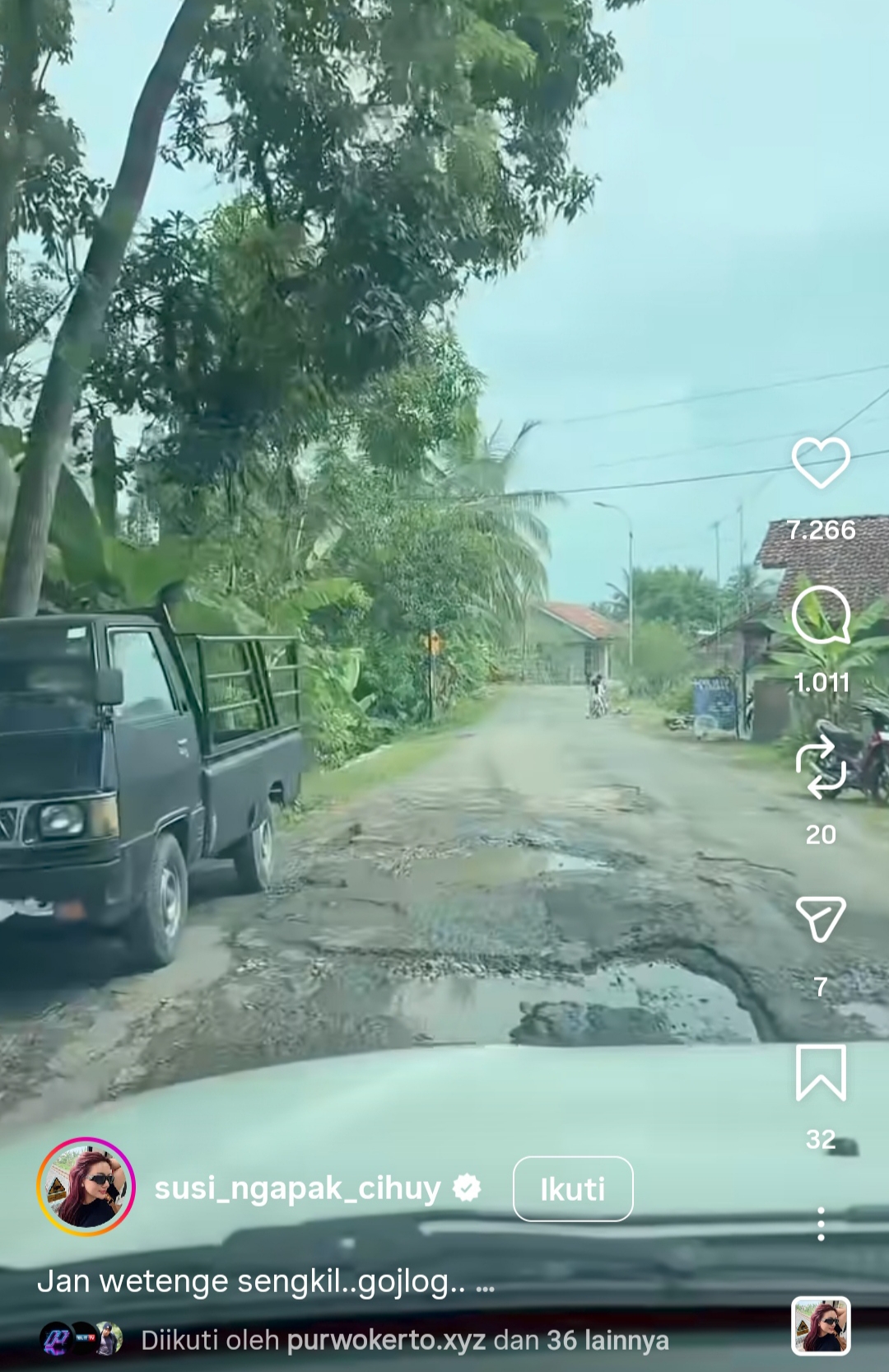 BANYUMAS – Artis yang juga penyanyi ternama asal Banyumas Susi Ngapak baru baru ini menyoroti jalan rusak di daerah Karangbawang Kecamatan Ajibarang.